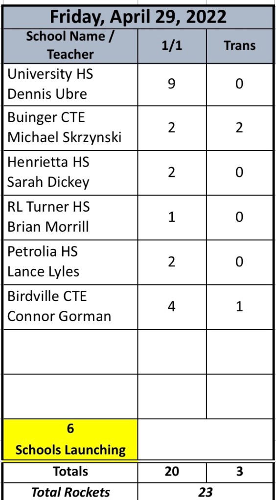 Tomorrow’s original schedule shows 6 schools and 23 rockets. Since Henrietta HS launched today, that adjusts tomorrow’s schedule to 5 schools and 21 rockets.