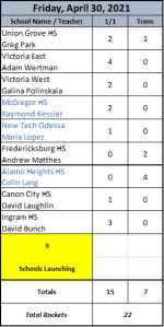 Currently there are 54 rockets scheduled for launch by 16 schools at the Stonewall location for Rockets 2025. This schedule may be updated this week with the possibility of schools adding or dropping close to launch time.
