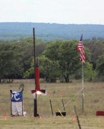 There was one particular rocket with a very different fin configuration today. Unfortunately I cannot remember the rocket’s actual name, but we all nicknamed it the Windmill. It was designed by Marble Falls High school and sported two sets of fins the larger of which gave it the appearance of a windmill fan. We were all quite interested in the launch of this vehicle since we hadn’t seen fins like this before, and were curious as to how they would perform. Below is the vehicle in stage 3.