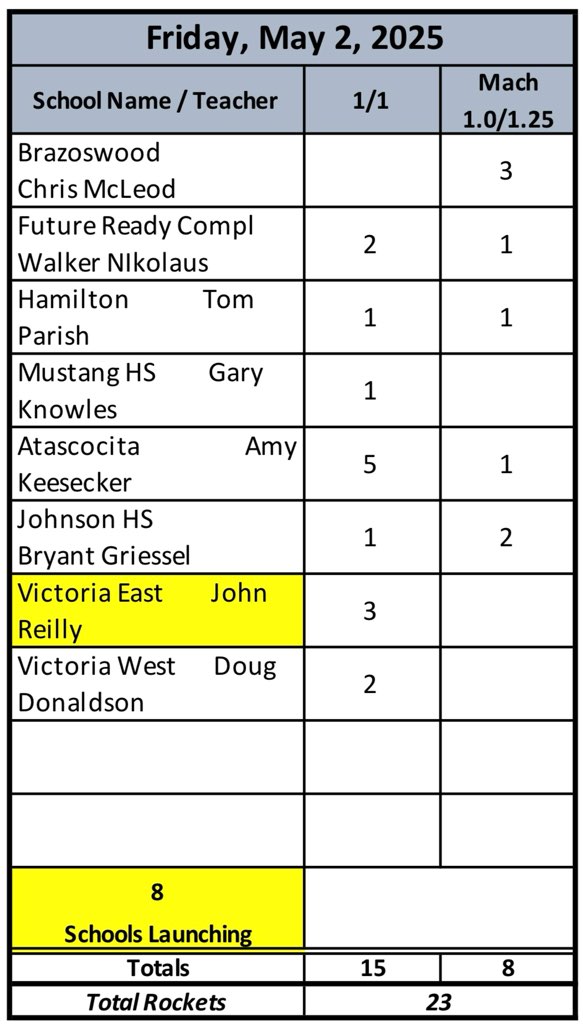 Schools Participating were Alamo Heights, Union Grove, Anahuac/Hardin Jefferson, and Brazoswood. Alamo Heights and Union Grove were fit with charges and loaded onto the rails for launch tomorrow morning. Brazoswood will load the rail tomorrow as the third launch. They have been ready and waiting today. Unfortunately, Anahuac/Hardin Jefferson developed a leak during FRR and pressure checks today that could not be contained so that had to scrub their launch for tomorrow. They will be coming out to watch the launches from Tula G with the other schools.