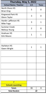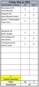 Currently there are 54 rockets scheduled for launch by 16 schools at the Stonewall location for Rockets 2025. This schedule may be updated this week with the possibility of schools adding or dropping close to launch time.